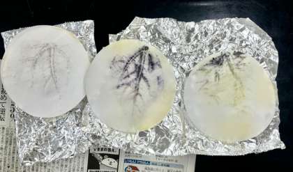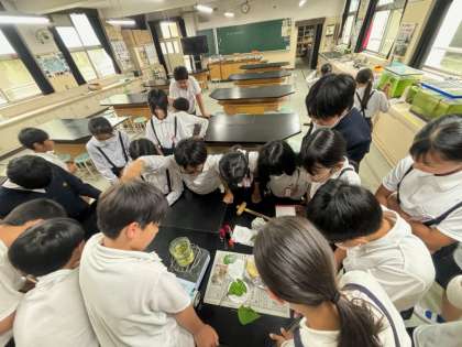 ろ紙に写した葉の緑が、ヨウ素液によって青むらさき色になったときには、大歓声。