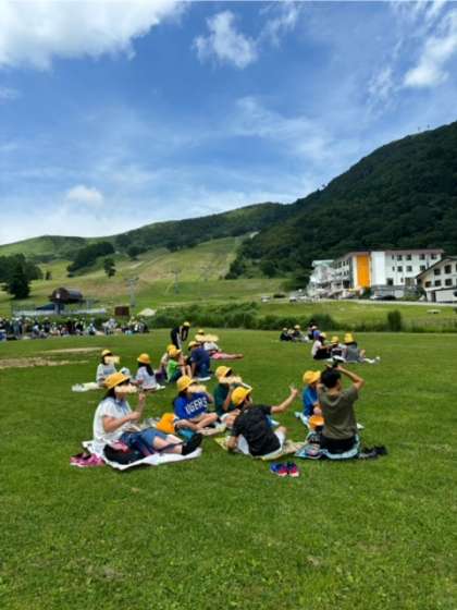 活動班でいただきますをして食べています。