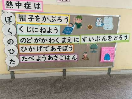 「ぼ」は帽子をかぶろう「く」は九時に寝よう「の」のどが渇く前に水分をとろう「ひ」ひかげであそぼう「た」食べよう朝ごはんです。どこかに濁音をつけると有名なロボットの友達の名前が隠されています。規則正しい生活を心がけ、頭文字で熱中症予防を覚えて暑い夏を乗り切りましょう!