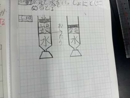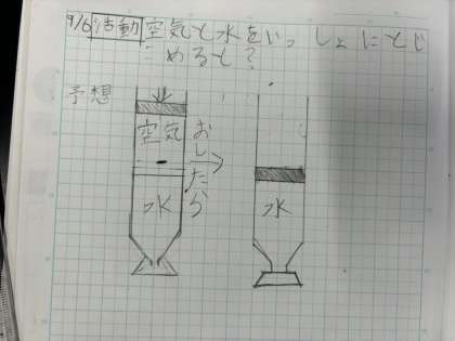注射器の中に空気と水をとじこめた様子を図にかき、ピストンを押すとどうなるか、予想しました。