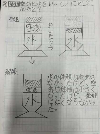 今日は、「空気と水をいっしょにとじこめるとどうなるか」という問題について、予想を立て、実験を行い、得られた結果から考えをまとめる活動をしました。