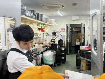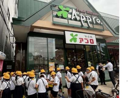 今日は、社会見学に食品館アプロへ行きました。普段からお家の人とよく行く子も多いので、みんなわくわくしながら行きました。クラスを2つに分け、売り場で「産地調べ」をするグループと店長さんの案内でバックヤードを見学するグループに分かれて店内に入りました。