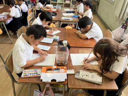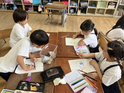 ザリガニを育てています。図画工作科でザリガニを描くので学校の先生方がザリガニをとってきてくれました。2年生は大喜び!!水替えやえさやりを続けています。作品展でザリガニの絵を飾る予定にしているので楽しみにしておいてください。