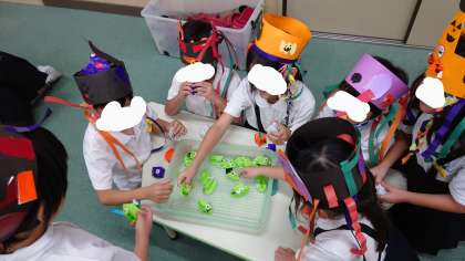 先日、参観時にお手伝いいただきましたハロウィンの冠が完成しました!どの作品も個性的でとても面白い作品に仕上がっています。持ち帰りますので、どうぞご覧ください。