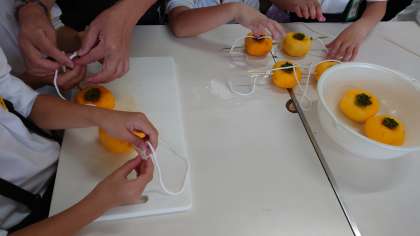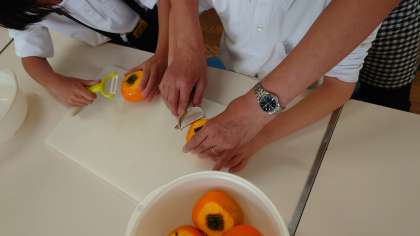 1・2年生で吊るし柿を作りました。普段入ったことのない家庭科室で、ピーラーを使って、柿の皮をむきました。グループでピーラーを交代しながら、みんなで上手に皮をむくことができていました。