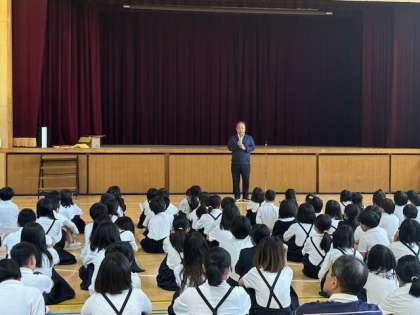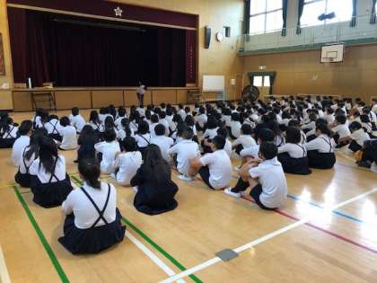 雨でグラウンドの状況が悪く、講堂での朝会となりました。