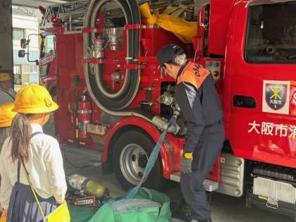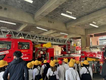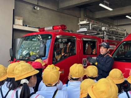 外に出てからは、たくさんの消防自動車を見学しました。車体にあるアルファベットの意味も教えていただきました。CCは、指揮をする車。Lは、はしご車のことなど。また、はしご車は、車体が11mもあり、はしごは40mも伸びることも教えていただきました。