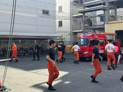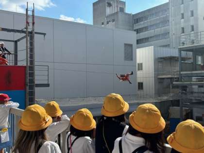 最後に、訓練の様子を見せていただきました。はしごを駆け上る訓練やロープを渡って救助に向かう様子を見せていただい、子どもたちは、「すごい!!」「速すぎる!」と驚き、歓声を上げていました。また、子どもたちが見学している間も消防士の方々は、いろいろなトレーニングをされていました。