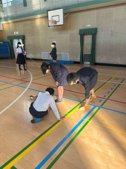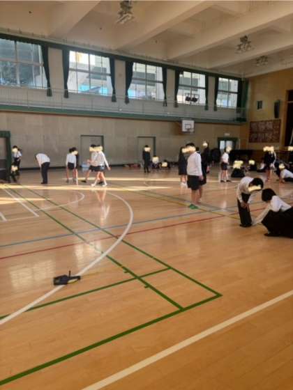 今日の算数は講堂でしました。10歩のきょりを3回計測して、平均を使って歩はばを調べました。