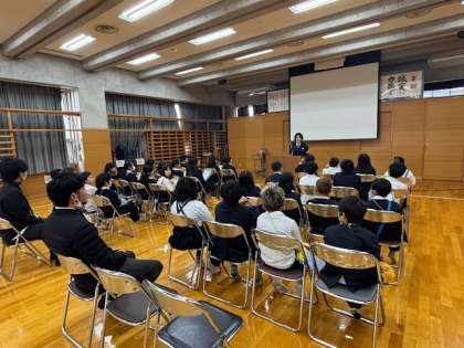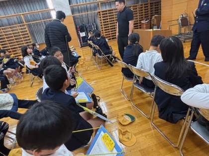 最後に、全員そろったところで、自転車の乗り方のマナーについての説明や、質問タイムをしていただきました。質問タイムの中で、普段警察官が使っている警棒や手錠、竹刀を触らせていただきました。たくさん質問にも答えていただき、子どもたちも大満足で、大変勉強になりました。