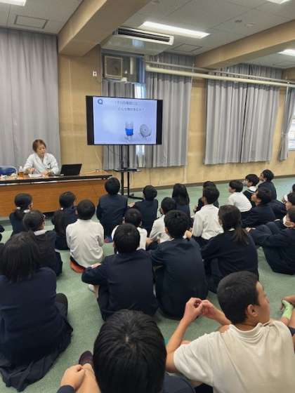 5時間目に学校薬剤師から薬の正しい使い方と薬物乱用についてお話がありました。薬は水かお湯で飲まないと効き目がなくなってしまうことをジュースやお茶で飲んだ場合の実験を交えながら話していただきました。みんな興味を持ち聞いていました。