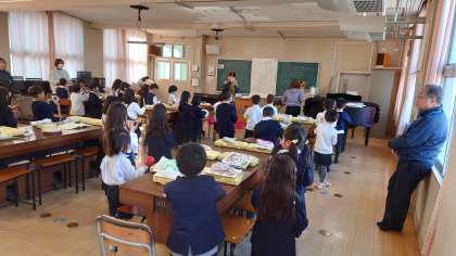 楽器を使ってみんなで演奏しました。カスタネットや鈴など、いろんな楽器があって、みんなで交代しながら使いました。今日は、校長先生も見に来てくれました。みんなはいつも以上に張り切って、楽器を演奏していました。