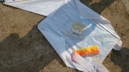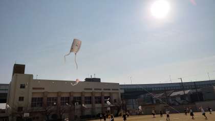 凧あげをしました。1年生の子たちは、元気よく、たくさん走って凧をあげることができていました。みんなが慣れてくると…、友達の凧と糸がからまってしまうことも(汗)先生たちにほどいてもらって、また元気に走り回っていました。