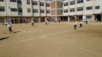 体育では、ボールをけり運動をしています。みんなけりすぎて、ボールが遠くへ行ってしまうことがないよう、気を付けながら、ボールをけっていました。サッカーを習っている子の中には、「試合したい!」と話している子もいました。