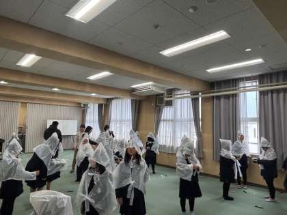 運動場では、バケツリレー、水消化器、煙テントの訓練。講堂では、救命救急と簡易担架の体験。多目的室では、1.2年生が新聞スリッパ作り、3年生はカッパ作りをしました。