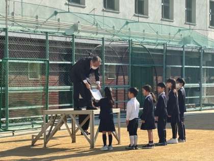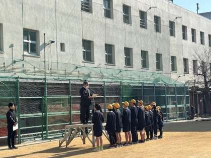 今日はよく晴れて暖かい陽射しが運動場の大部分に届いています。春らしくなってきました。