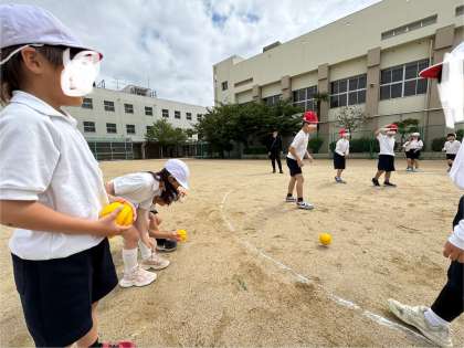 地域の方からいただいたソフトボールを使って、体育を楽しみました。みんな仲良く、ボールを使うことができました。
