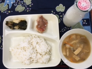今日のこんだて:赤魚のしょうゆだれかけ みそ汁 わかたけ煮 ごはん 牛乳