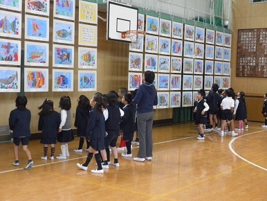 児童朝会で、お友達の作品の○良くできているところ○面白いなと思ったところを探して作品の鑑賞をしましょうと話をしました。お友達の良いところ、がんばったところ、そして自分の良いところがんばったところを見つけ、「自分によいところがある」と自信を持つ児童が一人でも多くなりますように。
