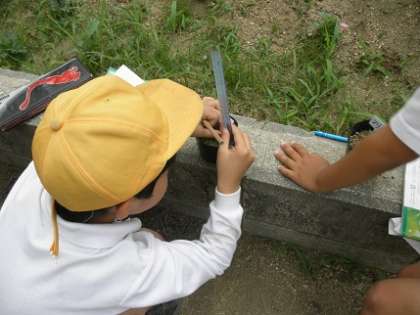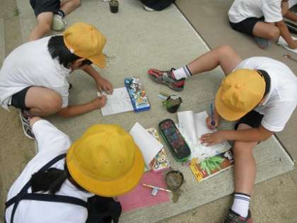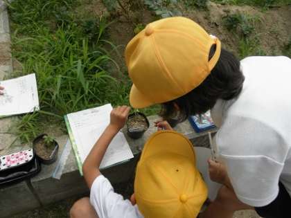 「植物の育ちとつくり」の授業です。マリーゴールド、ホウセンカを育て観察し、記録をとっています。素晴らしい集中力です。