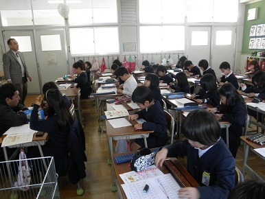 大阪市学校支援人材バンクから上村亘先生をお招きして、3年生と4年生でそろばん教室を行います。本日は3年生です。電卓もいいんですが、そろばんの魅力も知って欲しいと思っています。