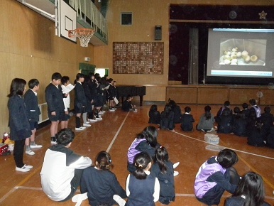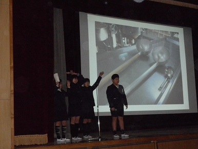 給食週間にちなんで、本日の児童集会で、児童の広報委員会(給食委員会も兼ねる)の発表で給食について学びました。クイズで、給食で大切なことや調理に使う器具について知りました。加えて調理の様子をビデオで見るなどし、その大変さも知ることができました。日本の給食の歴史についての発表もあり、大変充実した内容でした。これからも感謝しながらおいしく給食をいただきます。