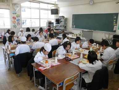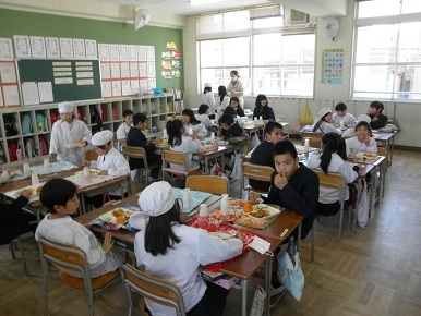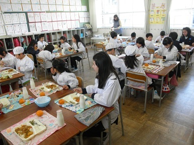 本日、兄弟学年・学級(例えば1年生と4年生、2年生と5年生、3年生と6年生)でふれあい交流給食を行いました。クラスのおおよそ半分が残り半分が移動し、それぞれの教室で給食を食べます。どうですか、みんなとても楽しそうに大好きなポークカレーライス、ごぼうサラダ、みかん、牛乳を食べていますよ。写真は5年生が移動し、2年生の教室で一緒に食べているところです。