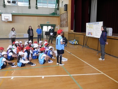今回は攻め(3人)と守り(2人)のあるシュートゲームです。ドッジボールと違い、人に当てるのでなく、まとに当てるゲームであるため、ボールに対する恐怖心が軽減されます。またこのゲームは味方が捕りやすいパスを回すことや、ボールを持っていないときも、ボールが来るコースに入ったりパスがもらえる位置に移動することが重要です。
