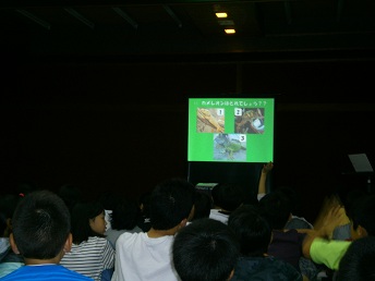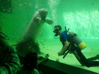 写真は1枚目が鳥羽水族館でのジュゴンへのえさやり。2枚目がアシカショー、3枚目が夜の宿舎での学習会です。