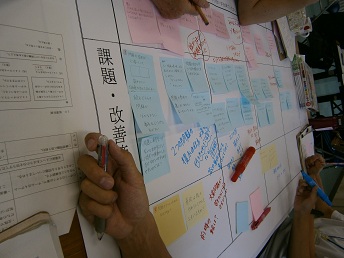 写真の1枚目はタブレットを使ったヒントカードです。2枚目は授業の様子。3枚目は研究討議会での班別討議での分析の様子です。