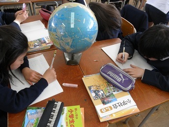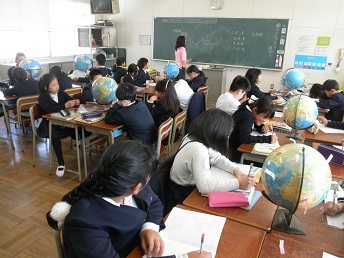 5年生で地球儀を使って、社会科の授業をしています。単元は「日本ってどんな国—日本のまわりの国々」です。世界の中の日本、グローバルな視点もここから始まります。