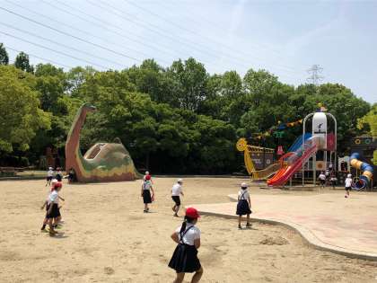 おいしいお弁当を食べた後、さっきまでの「ロケット広場」から「恐竜広場」へ移動しました。まだまだ遊びます!