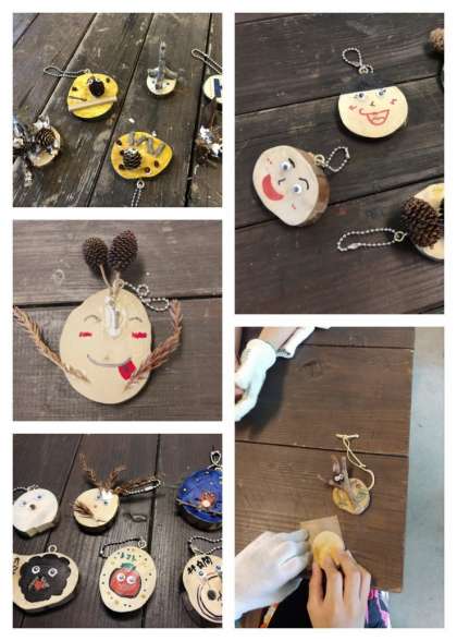 木の表面をヤスリでこすり、つるつるにしたら、思い思いに木の枝や木の実を貼りつけ、素敵なキーホルダーができました。