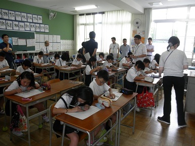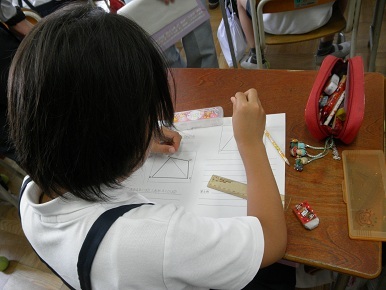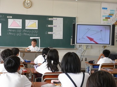 本日5年生で教育研究会旭区算数部研究授業を行いました。単元は「形も大きさも同じ図形を調べよう」です。目標は「合同な三角形の書き方(既習事項)を使って、合同な四角形の書き方を考える」です。作図の方法を発表する際に、OHC(オーバーヘッドカメラ)を使って電子黒板を使用しました。どの児童も落ち着いて非常に上手に発表ができていました。発表を聞くほうにとっても理解しやすかったようです。
