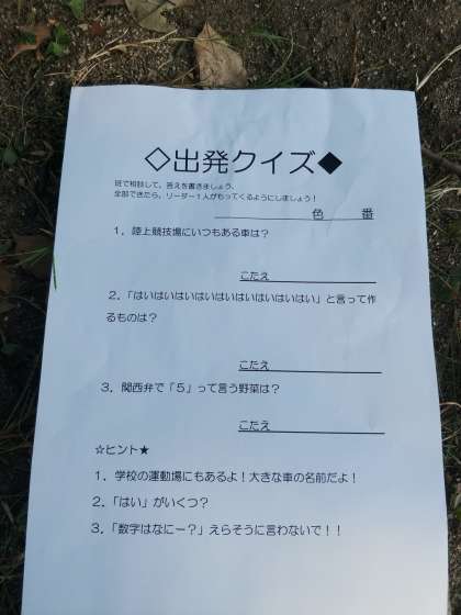 開会式を終え、出発クイズを全問正解した班から出発しました。クイズは、班によって違います。すぐひらめく班や、なかなかひらめかない班、いろいろありましたが、全班無事に出発しました。