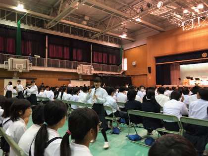 5年生が大宮中学校の文化発表会を見学に行かせて頂きました。最初に吹奏楽部の演奏です。聞いたことのある曲をたくさん演奏してもらい、「中学生になったら、吹奏楽部に入る」などの声が聞こえていました。その後展示物を見学し、プロジェクションマッピングも見せて頂き、とても楽しい時間を過ごすことができました。