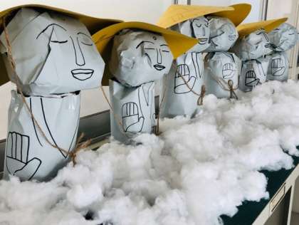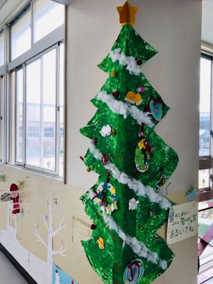 2階エレベータホール前の廊下が冬模様になりました。サポート学級の児童達で作ったクリスマスツリーや、2年生の国語で学習する「かさこじぞう」を飾っています。クリスマスソングを歌いながら、楽しそうに通り過ぎていく子供達もいます。