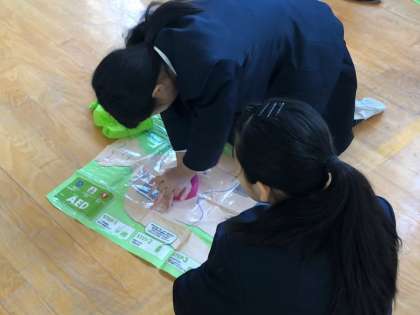 まず、けがをした時に使える三角巾の作り方について教えていただき、その後、おぼれてしまった人を助ける際などに行う「心肺蘇生法」について学習しました。子ども達は2人1組になって、互いに動きを確かめ合いながら、真剣に取り組んでいました。