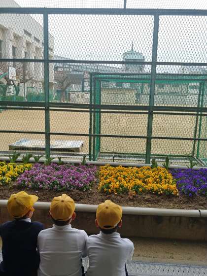 休み時間に遊ぼうと思って出てきたら雨。3人は懸命に『雨やめ』コールしています。