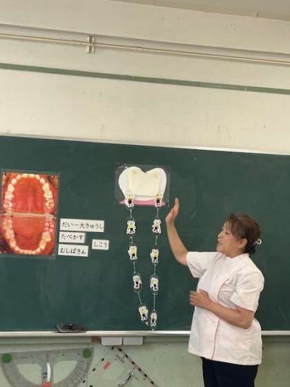 9月19日歯科衛生士が来校し、むし歯や歯のみがきかたについて学びました。歯垢が赤く染まる歯垢染め出しをして、鏡で観察し色をぬりました。