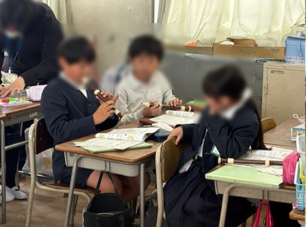 教室の片隅では、笛のテストを