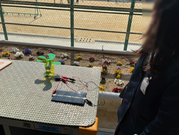 太陽光電池を使った実験で、太陽の光で、モータープロペタが回ると歓声があがっていました。