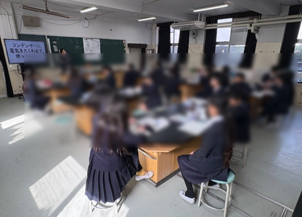 手回し発電機を使って、コンデンサに電気をためて、電球を光らせる実験をしていました。