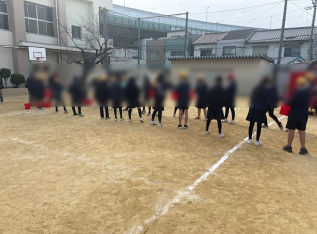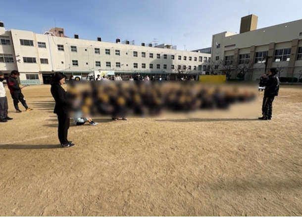 まずは、全校で地震、津波想定の避難訓練。約3分で全員が運動場に避難することができました。