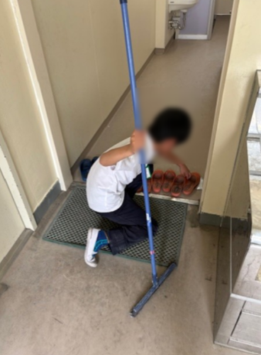 階段をぞうきんで磨いている子ども