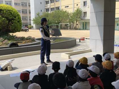1〜3年生は、道路の歩行の仕方についてお巡りさんからじっくりと学びました。