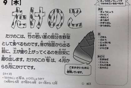今日の給食献立では、「ごまかかいため」に「たけのこ」を使用してました。