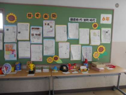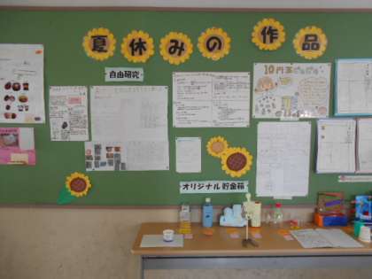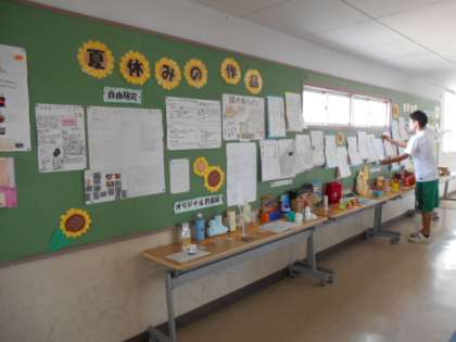 高学年の教室の前には夏休みにそれぞれが作った作品が飾られています。