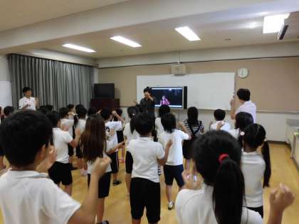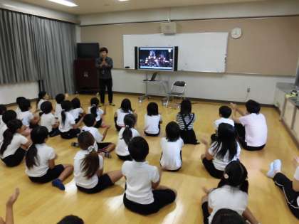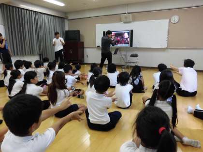 だんぢりの歴史、実際の映像、龍踊りなどたくさんのことを教えてもらいました。実際に龍踊りを少し踊っていただき子どもたちもすごく興味を持って見ていました。