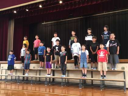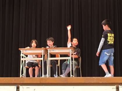 今年の四年生の学級目標は、「何があってもあきらめず、友だちを大切にするクラス」です。人権集会で、このことを伝えるため、自分たちで劇を考えました。